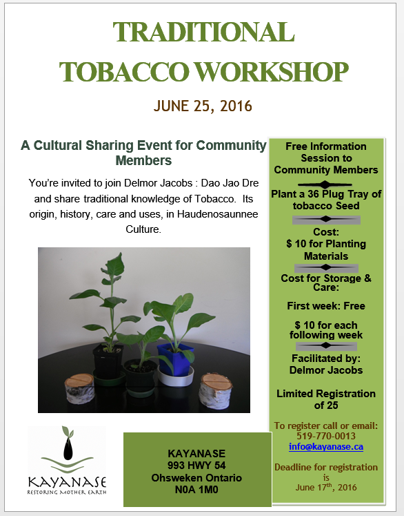 To register call or email 519-770-0013 or email info@kayanase.ca — Deadline for registration is June 17, 2016.